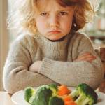 Niña de unos 4 años, con expresión seria y brazos cruzados, sentada frente a un plato con brócoli y zanahorias, en una mesa iluminada por luz natural.
